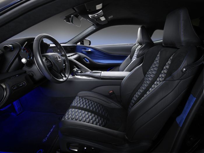 Bagian interior dihias jok kulit warna hitam kombinasi biru pada door trim plus lampu interior biru pada footstep.