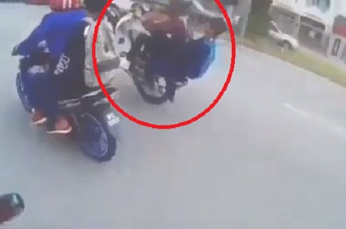 Dilansir dari akun instagram @guyonankekinian ada seorang anak yang sedang berboncengan melakukan wheelie.