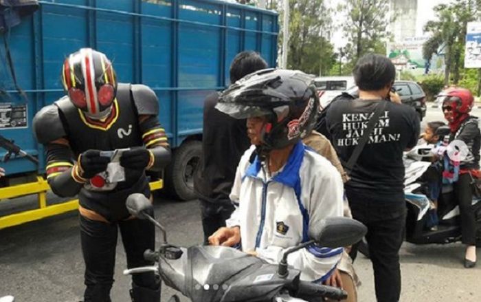 Baja Hitam membantu polisi memeriksa surat-surat kendaraan pengendara.
