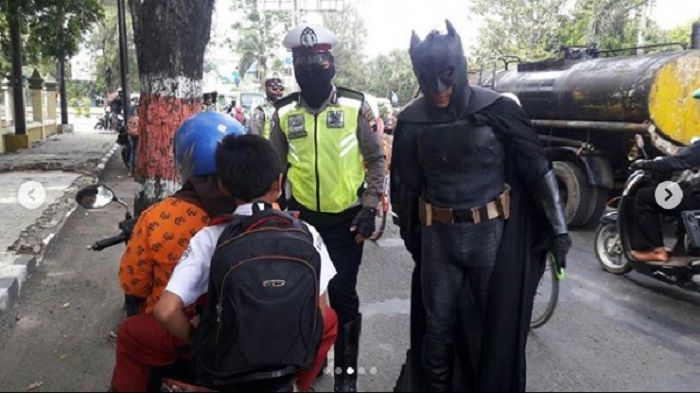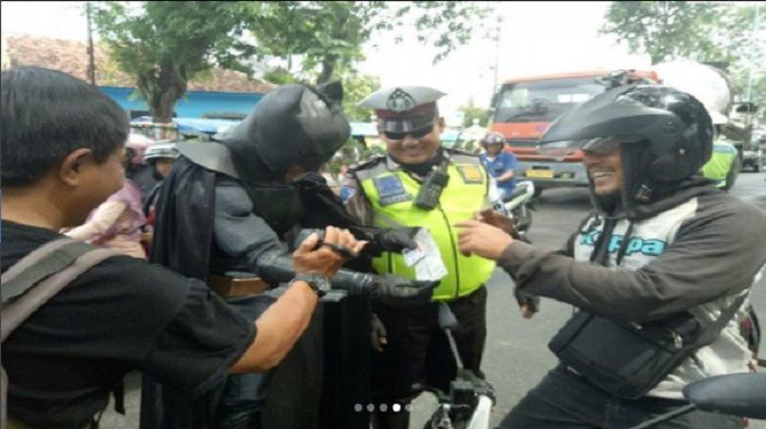 Tak hanya menemani, Batman juga ikut memeriksa surat-surat kendaraan bapak tersebut.