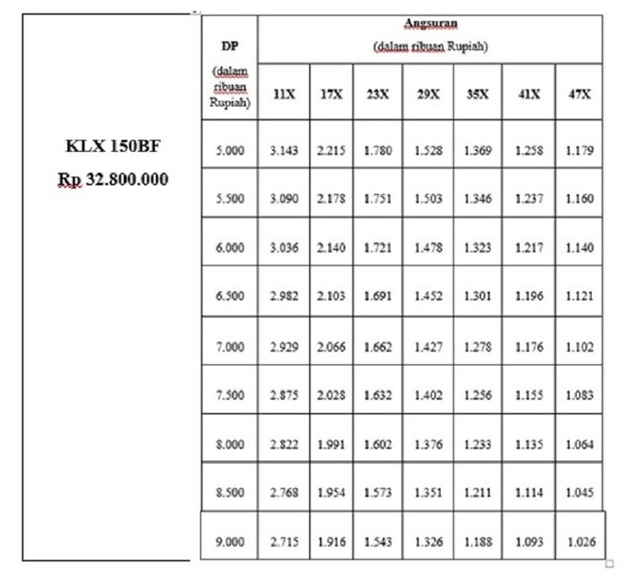 Daftar uang muka dan cicilan Honda CRF150L
