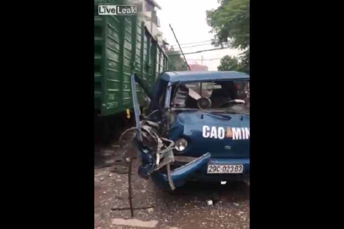 Mobil pick up yang parkir sembarangan ini diserempet oleh kereta api pengangkut barang.