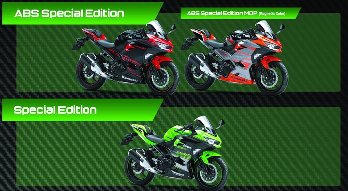 Varian tengah-tengahnya yaitu special edition non Anti-Lock Braking System alias ABS, New Kawasaki Ninja 250 dikelir hanya satu, yaitu Green SE Kawasaki Racing Team (hijau).
