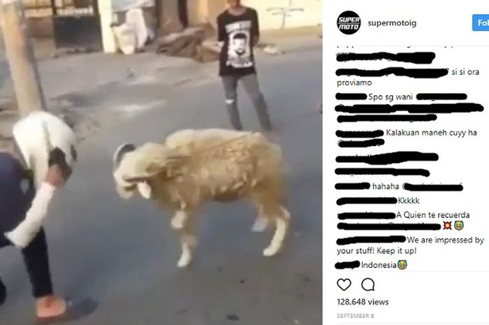 Kids zaman now itu terlihat melakukan tes helm dengan beradu kepala dengan kambing.