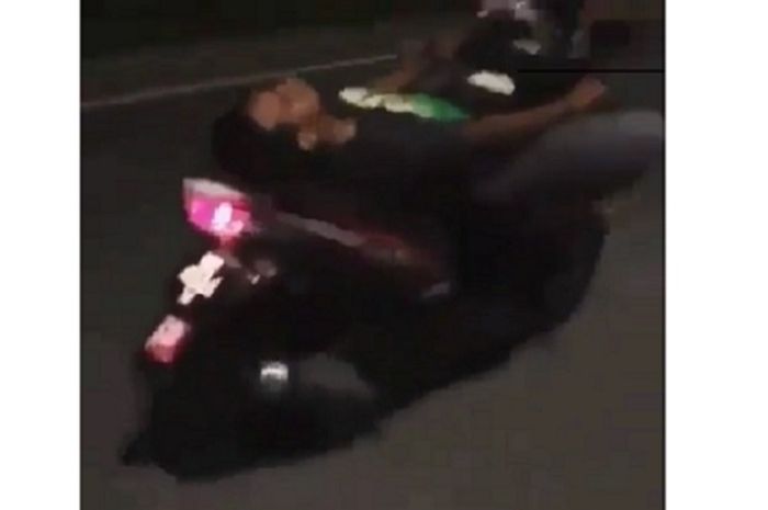 Video yang diposting di Instagram akun @braapfeed memperlihatkan cowok bergaya tidur di atas skutik.