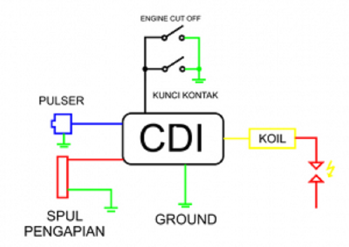 3. Setelahnya, potonglah kabel massa, lalu ganti dengan sakelar on/off. Anda harus tahu warna kabel yang ada pada CDI kendaraan, karena biasanya setiap standar pabrikan berbeda-beda