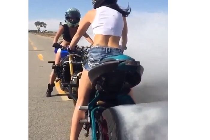 Seperti yang GridOto.com lihat dalam akun instagram @viral.bikers, ada dua orang wanita yang sedang melakukan aksi burnout.