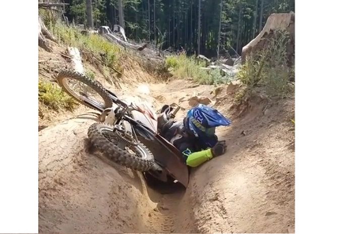 Namun, tampaknya sang anak terjatuh dan tertimpa motor trailnya.