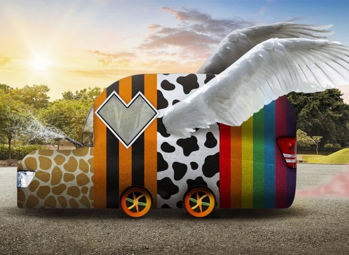 Mobil ini diberi sayap agar bisa terbang. Tak hanya diberi corak meriah, mobil ini juga punya pistol jaring laba-laba di bagian kap mesin. Bukan asap, knalpot mobil ini mengeluarkan musik, tulis Lina.