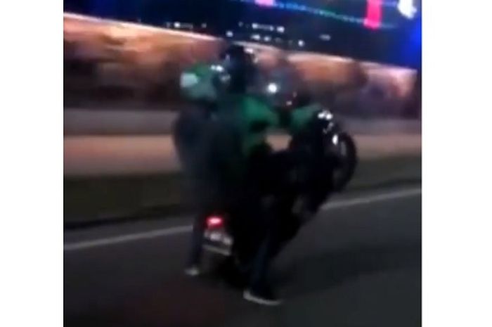 Seorang driver ojol terlihat sedang berboncengan dan melakukan aksi wheelie.