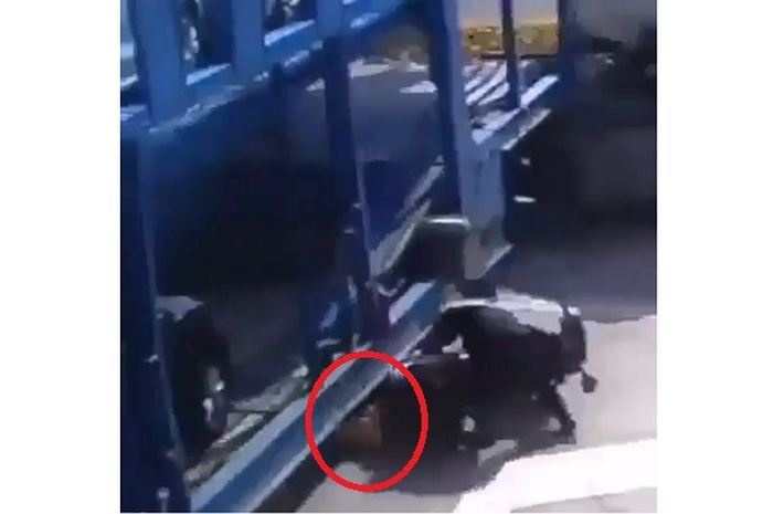 Hasilnya, motor tersebut pun jatuh dan terseret oleh truk.