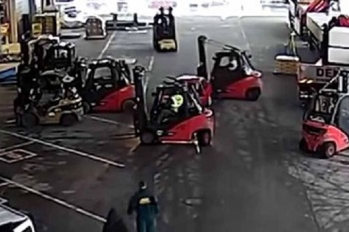 Tapi ternyata perlakuan tersebut ketahuan oleh salah satu pekerjanya yang lantas mengemudikan forklift untuk menghalanginya pergi.