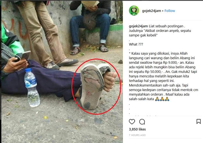* Kalau saya yang dilokasi, insya Allah langsung cari warung dan beliin Abang ini sendal swallow harga Rp 9.000,- an. Kalau ada rejeki lebih mungkin bisa beliin Abang ini sepatu Rp 50.000,- . An. Gak muluk2 tapi hanya mencoba melatih kepekaan kita terhadap hal yang seperti ini. Mendokumentasikan sah-sah aja. Tapi semoga kedepan ceritanya tidak mentok cm menyalahkan orderan . Maaf kalau ada salah-salah kata," tulis akun @gojek24jam, Jumat (12/1/2018).