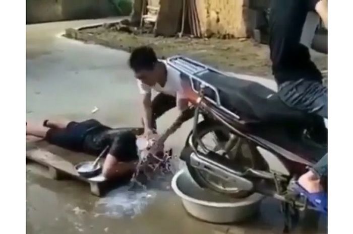 Air untuk untuk membasuh kepala orang tersebut dialiri menggunakan ban yang bertugas sebagai shower.