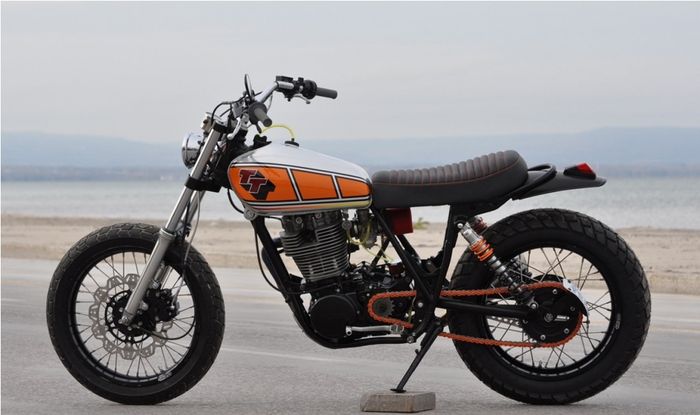 Pada bagian bodi sudah nampak perubahan pada jok, menemani tangki asli dari TT500 yang sudah diberi penyegaran tampilan.