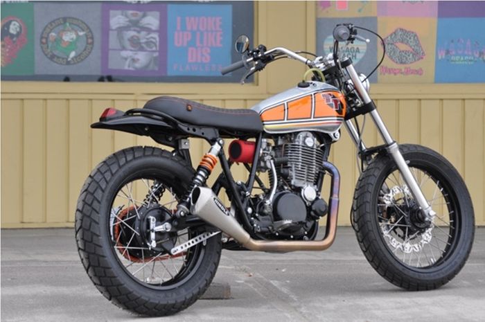 Warna manis orange candy ini dibuat menyerupai stripping dari TT500 yang dibuat ala livery Speed Block khas Yamaha.