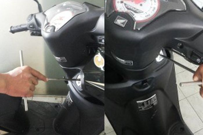 Kepala Bengkel Resmi AHASS PT Murni Motor Bogor, Haryanto, mempraktekan sulitnya memasukan kunci T ke lubang kunci jika setang dikunci ke kanan.