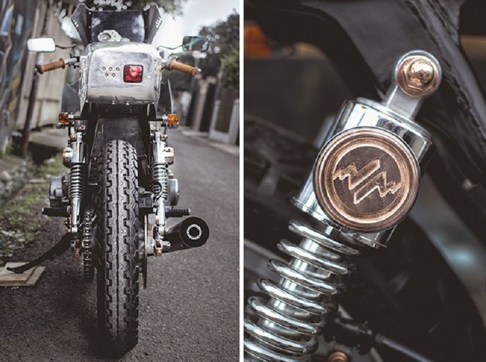 Tampilan ini berpadu apik dengan aksen tembaga pada beberapa detail kecil seperti tutup tangka serta shock belakang.