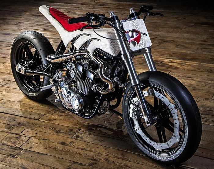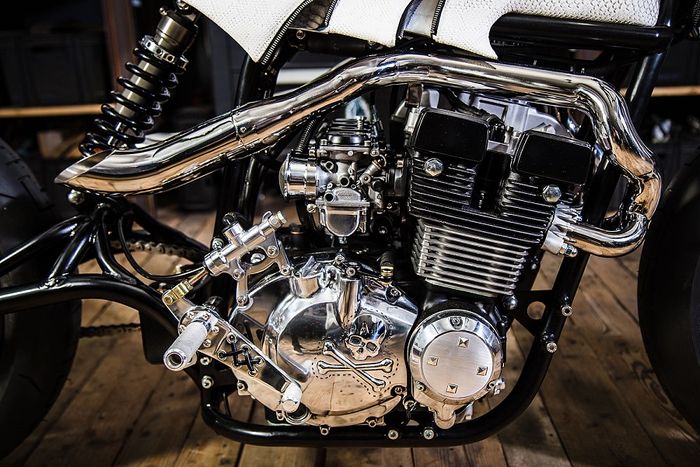 Bagian mesin juga punya tampilan yang tak kalah menarik, dengan blok samping yang diberi logo tengkorak.
