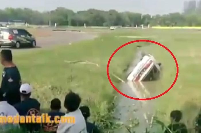 Mobil yang masuk ke parit tersebut pun berhasil dievakuasi oleh panitia.