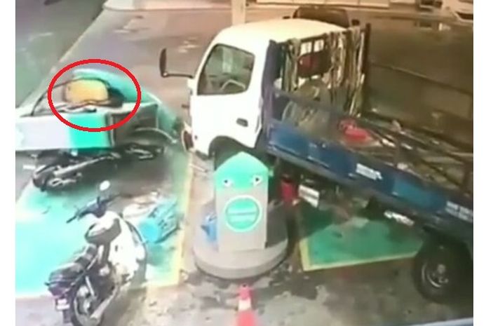 Namun, tak berapa lama kemudian, tiba-tiba sebuah truk datang dan langsung menabrak pengunjung berbaju kuning dan dispenser SPBU hingga terpental.