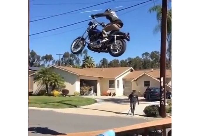 Pada saat melompat, motor sport klasik tersebut terlihat elegan di udara dan sepintas tak terlihat akan terjadi masalah.