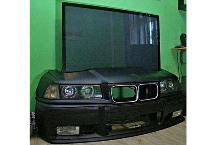 Sebuah muka mobil BMW E36 dijadikan rak tempat meletakkan tv.