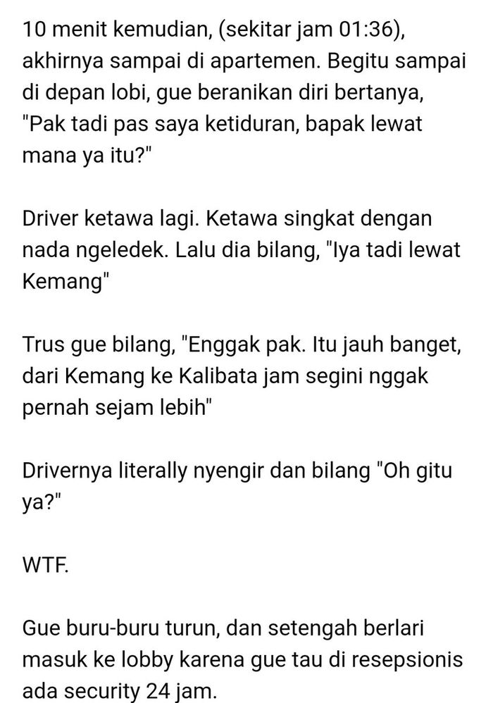 "Udah nyaris 1 jam sejak berangkat. Gandarian ke Kalibata nggak pernah sejauh ini tengah malam," tulis Twelvi dalam ceritanya.