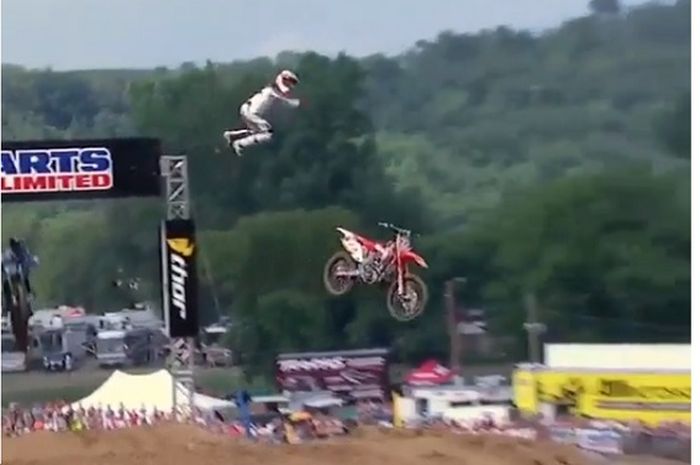 Hasilnya, crosser tersebut pun melompat tanpa motornya dan harus terjatuh menghantam tanah.
