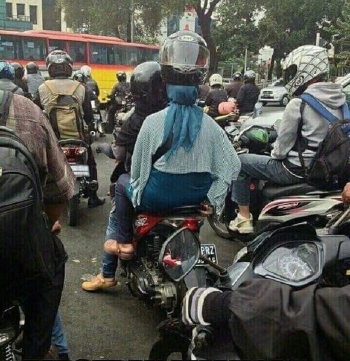 10. Emak-emak zama now, kepengin kelihatan kece tapi enggak mengindahkan keselamatan diri sendiri. Pakai helm yang benar dong bu, biar lebih aman.