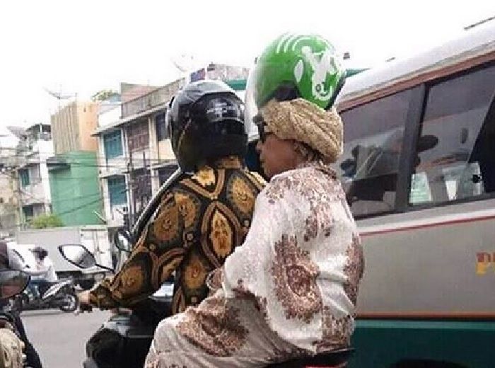 9. Si abang driver ojol enggak ngingetin penumpangnya ya? Pakai helm kebalik nih. Seharusnya pakai yang benar dan sampai berbunyi klik akan jauh lebih aman.