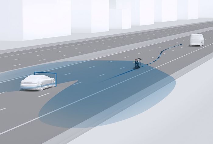 Sistem ini terus melakukan pengawasan ke segala arah untuk membantu pengendara motor berpindah jalur dengan aman.
