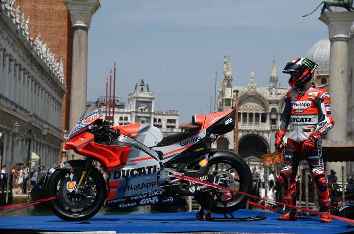 Setelah mengelilingi berbagai tempat, Desmosedici GP18-nya sudah menunggu sang pembalap di St. Mark's Square, tempat terkenal di Venice.