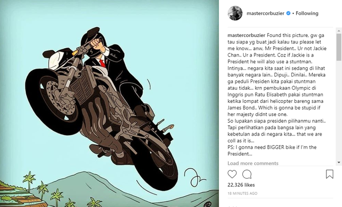 PS; Saya akan butuh motor yang lebih gede kalau saya presidennya...," tulis Deddy Corbuzier seperti dikutip Grid.ID dari akun Instagramnya @mastercorbuzier (20/8/2018).