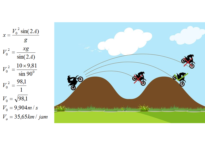 Jarak antara kedua puncak bukitnya 10 m, sudut elevasi bukit lompatannya 45 derajat, berapa kecepatan optimum agar motor bisa melewati bukit itu?