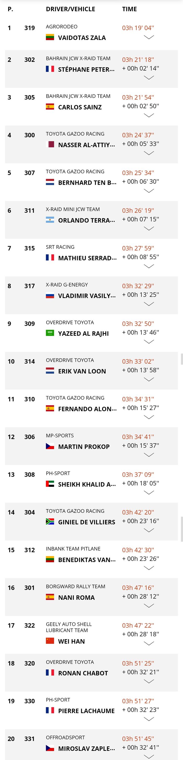 Di sisi lain mantan pebalap F1, Fernando Alonso yang melakoni debutnya di Reli Dakar harus puas finis di luar sepuluh besar.