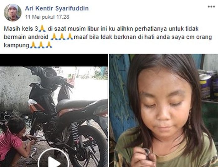 Dalam unggahan foto dan video di akun Facebook Ari Kentir Syarifuddin, terlihat seorang gadis cilik sedang mengotak-atik motor di bengkel.