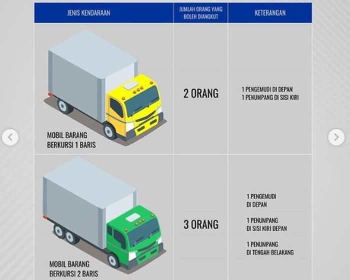 Sementara mobil pengangkut barang berkursi dua baris, dapat diisi tiga orang dengan ketentuan satu sopir, satu penumpang di samping sopir, dan satu penumpang di tengah bagian kursi belakang.