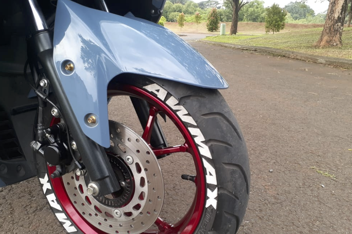 Termasuk tambahan tire bomb yang menghias dinding ban bertuliskan nama kebesaran motor ini yakni Awmax.