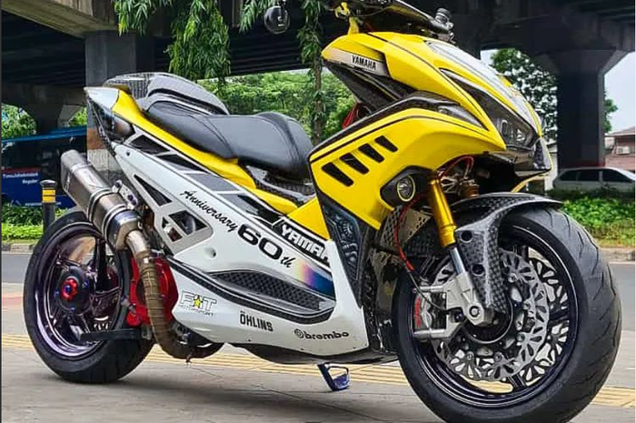 Dari tampilannya saja, Yamaha Aerox ini sudah sukses mencuri perhatian berkat balutan airbrush bertema 60th Anniversary Yamaha.