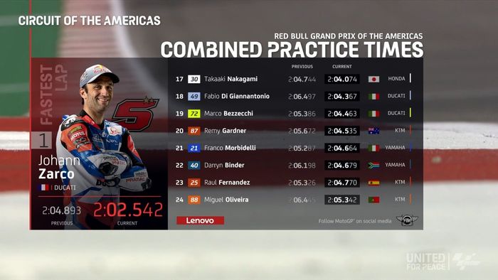Berikut hasil kombinasi sesi latihan hari Jumat MotoGP Amerika 2022 :