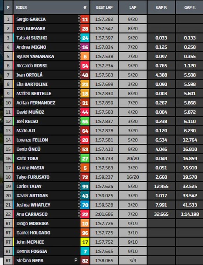 Sedangkan pembalap Honda Asia Team, Mario Aji tergeser hingga menempati posisi 19.