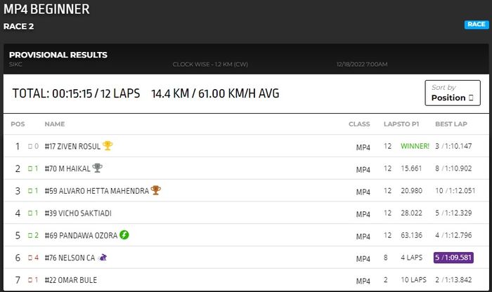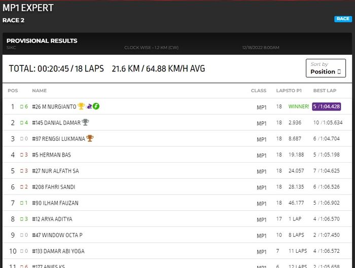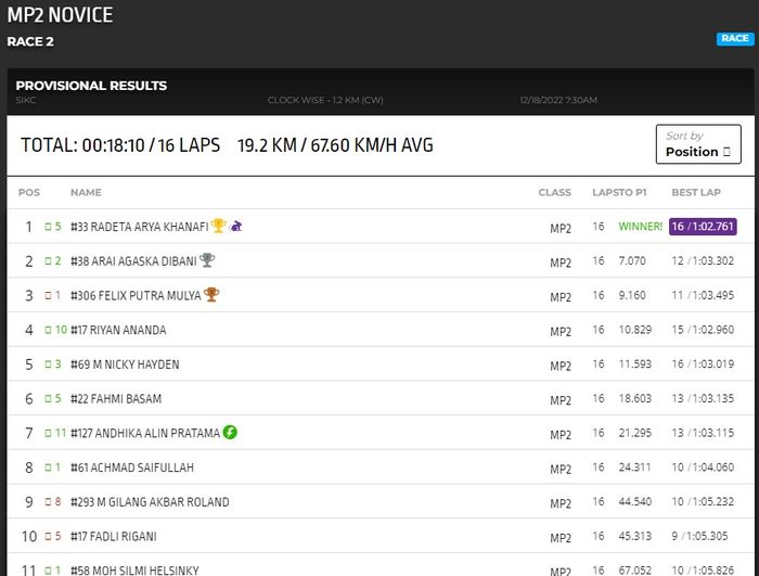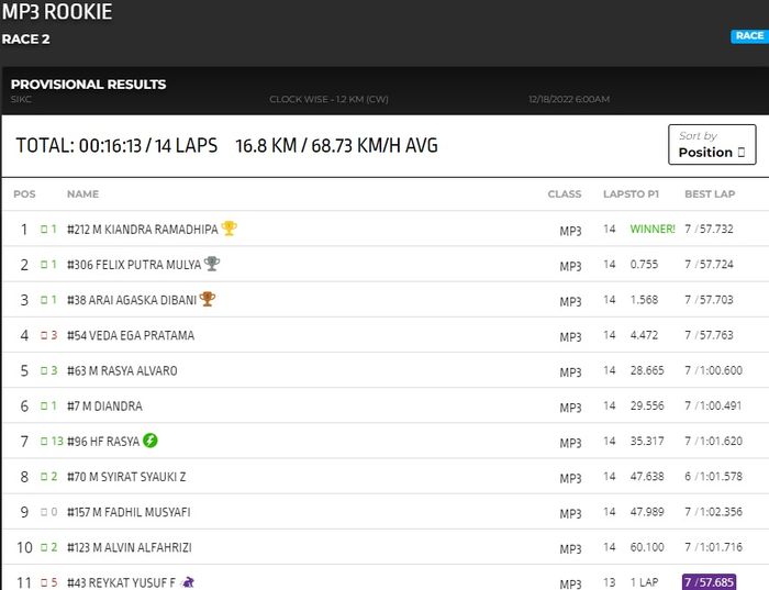 Di kelas MP2, Radeta Arya Khafi dari ART Jogja berhasil menang telak dengan seisih 7 detik dari Arai Agaska di posisi kedua.