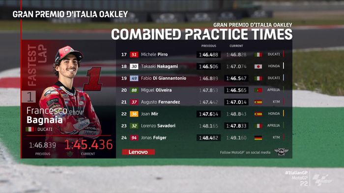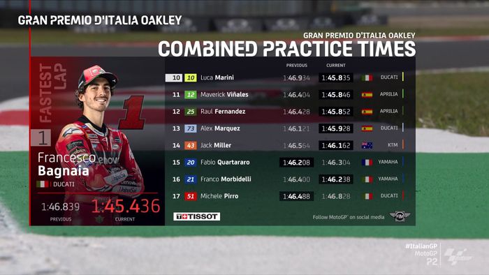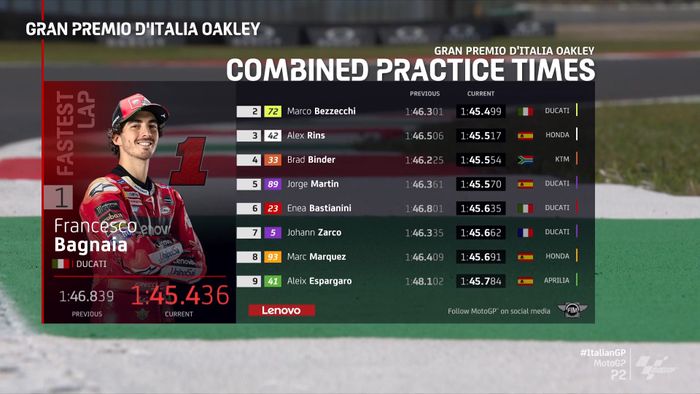 Berikut tabel waktu kombinasi FP1 dan FP2 MotoGP Italia 2023: