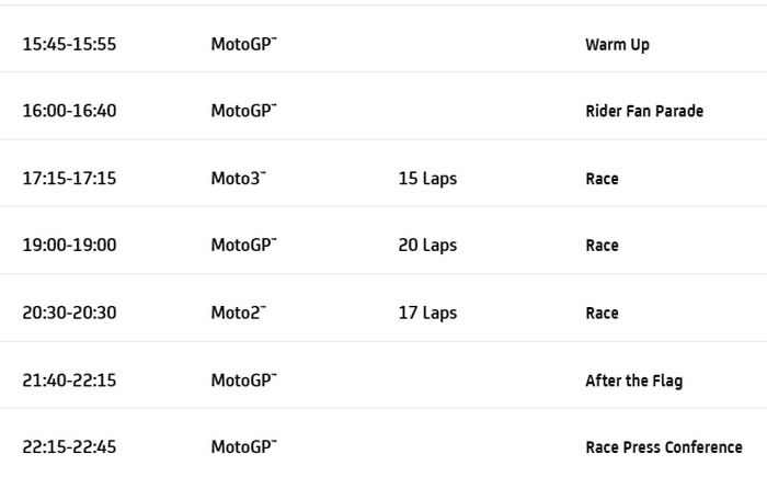 Hari Minggu pembalap kelas premier akan menjalani sesi warm up dan Rider Fan Parade, sebelum menjalani balapan.