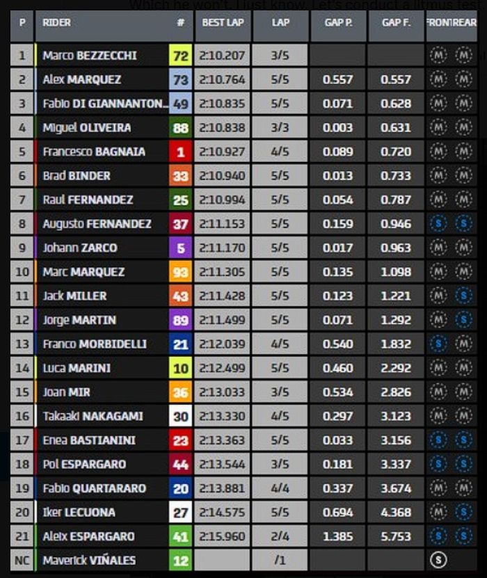 Sedangkan posisi ketiga dipegang Fabio Di Giannantonio, disusul dengan Miguel Oliveira dan Pecco Bagnaia.