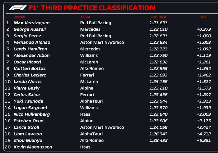 Sesi ini juga menjadi debut Liam Lawson, yang ditunjuk mendadak menggantikan Daniel Ricciardo di tim AlphaTauri.