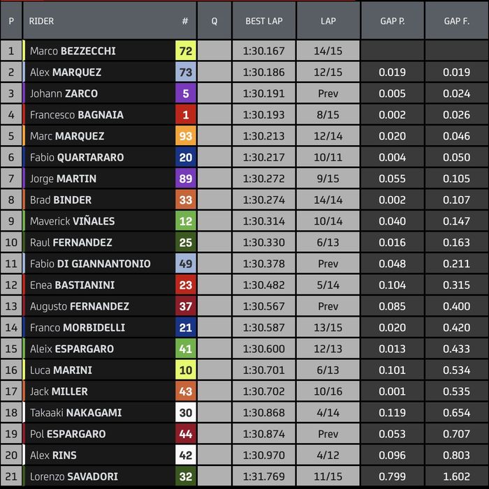 Posisi kedua dipegang oleh Alex Marquez, disusul Johann Zarco yang berada tepat di depan Bagnaia.