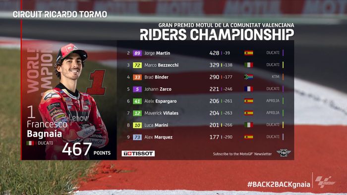Kemenangan balapan MotoGP Valencia 2023 membuat Pecco Bagnaia mengakhiri klasemen MotoGP 2023 dengan raihan 467 poin.