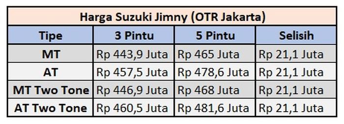 Berikut tabel lengkap harga Suzuki Jimny 3 pintu dan bocoran harga Suzuki Jimny 5 pintu yang Gridoto dapat beserta selisihnya.